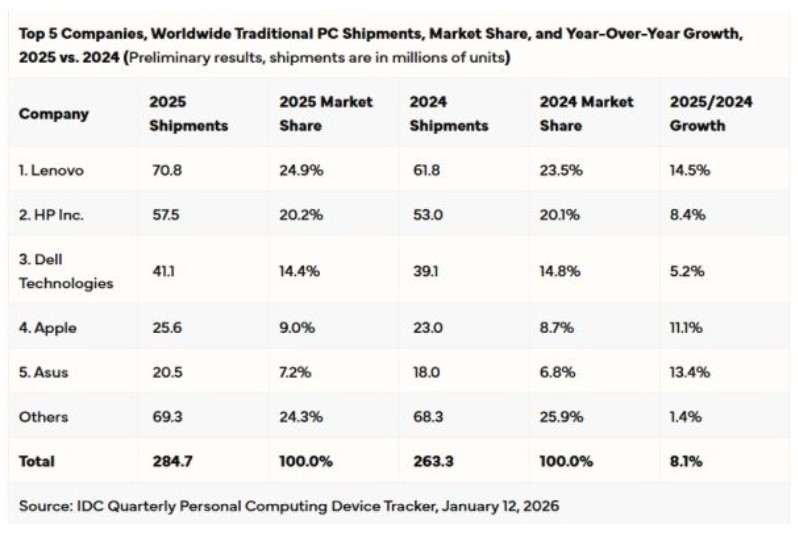 В течение 2025 года на мировой рынок было отгружено 248,7 миллиона готовых ПК, что на 8,1% превышает результат предыдущего года. Абсолютным лидером в декабре стала компания Lenovo, которая охватила 25,3% рынка с объемом поставок 19,3 миллиона устройств. Это на 14,4% больше, чем в 2024 году, что свидетельствует о динамичном росте популярности бренда.