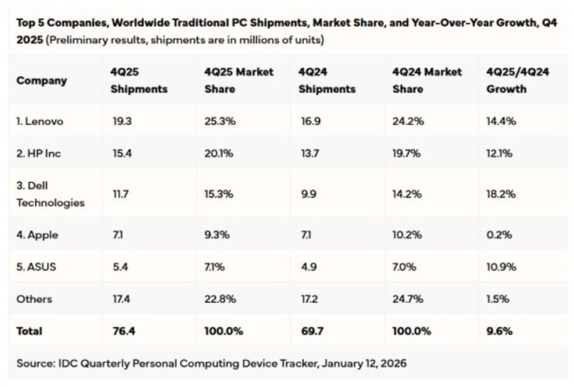 Международная аналитическая компания International Data Corporation опубликовала подробный отчет о глобальном рынке персональных компьютеров за 2025 год. Согласно данным, в четвертом квартале прошлого года объем поставок ПК составил 76,45 миллиона устройств, а основную долю рынка сконцентрировали пять крупнейших производителей.