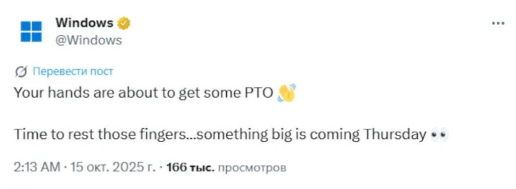 “Ваші руки отримають відпочинок. Час дати пальцям перепочинок… у четвер відбудеться щось важливе”, – йдеться в повідомленні на офіційній сторінці Windows у соцмережі X.
